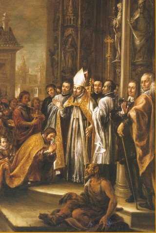 En 1673, el pintor sevillano Juan de Valdés Leal pintó una serie de cuadros sobre la vida de San Ambrosio para el oratorio bajo del palacio Arzobispal de Sevilla por encargo del arzobispo Don Ambrosio Spínola. Dos de ellos, de formato más pequeño y asuntos en los que hace su aparición lo sobrenatural, acompañarían en el altar a una Virgen con el Niño encargada a Murillo ese mismo año, mientras que los otros cinco, en los que se recogen los momentos culminantes del misterio del santo y sus virtudes como prelado ejemplar, se distribuirían por las paredes del oratorio. Todos ellos desaparecieron durante la Guerra de la Independencia, cuando el mariscal Soult convirtió el Palacio en su cuartel general, y de dieron por perdidos hasta que reaparecieron en 1960 y 1981 en el mercado del arte. |