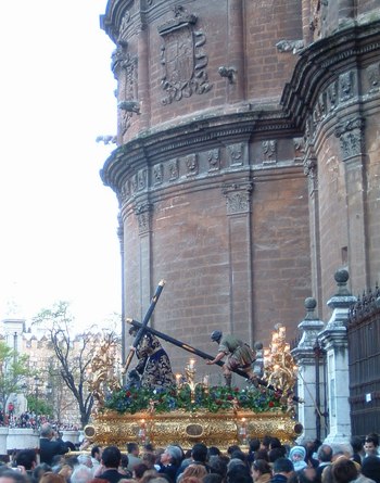 Tras el Nazareno itinerante de Pasión iba Jesús en su Tercera Caída de la Hermandad de San Isidoro. Esta cofradía tampoco pudo salir el Viernes Santo debido a la lluvia. El exorno floral al igual que el año anterior estaba realizado a base de hiedra, cardos, lirios, y capullos de rosas granate. Como es habitual en este misterio iba sin música. |